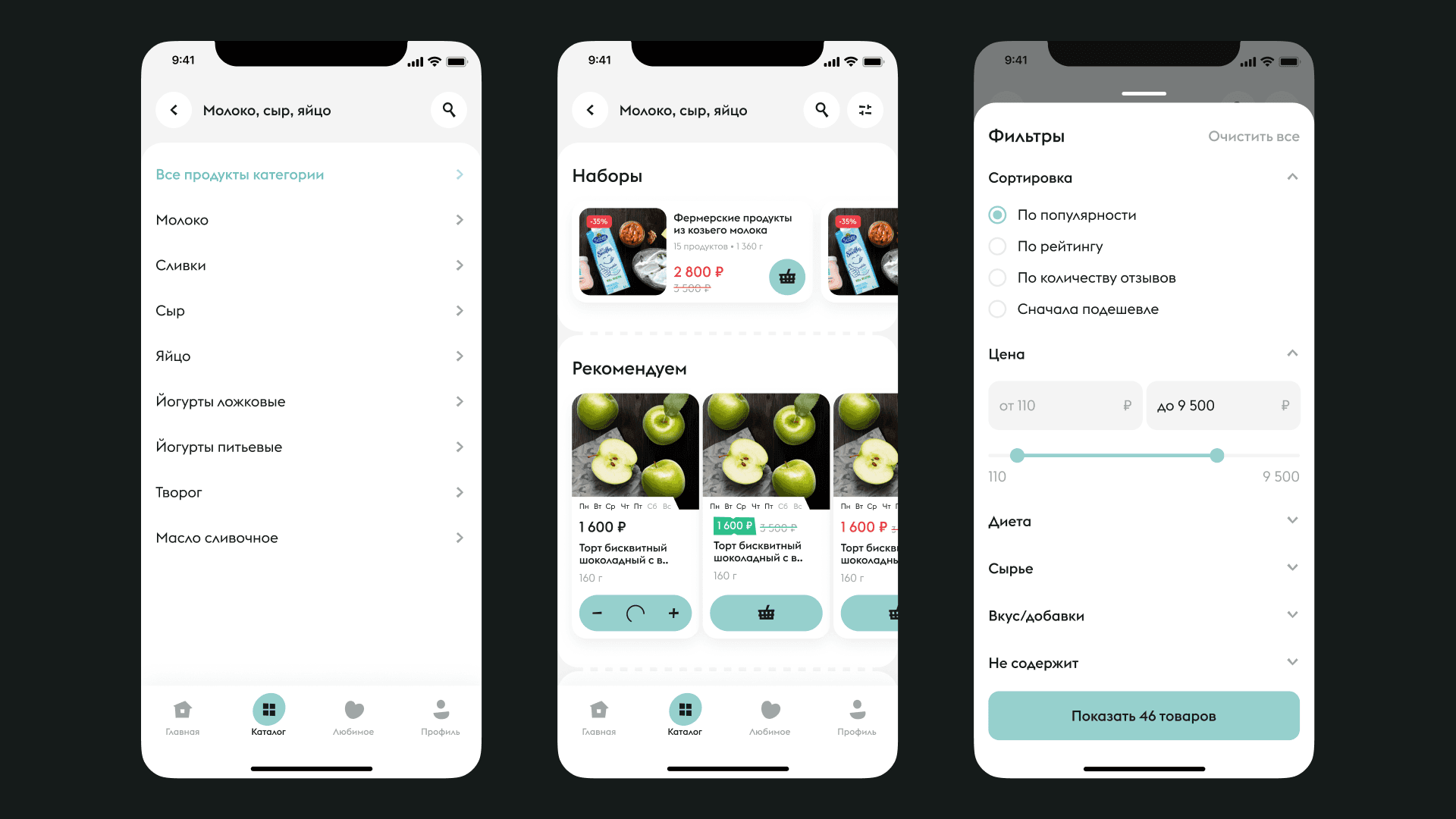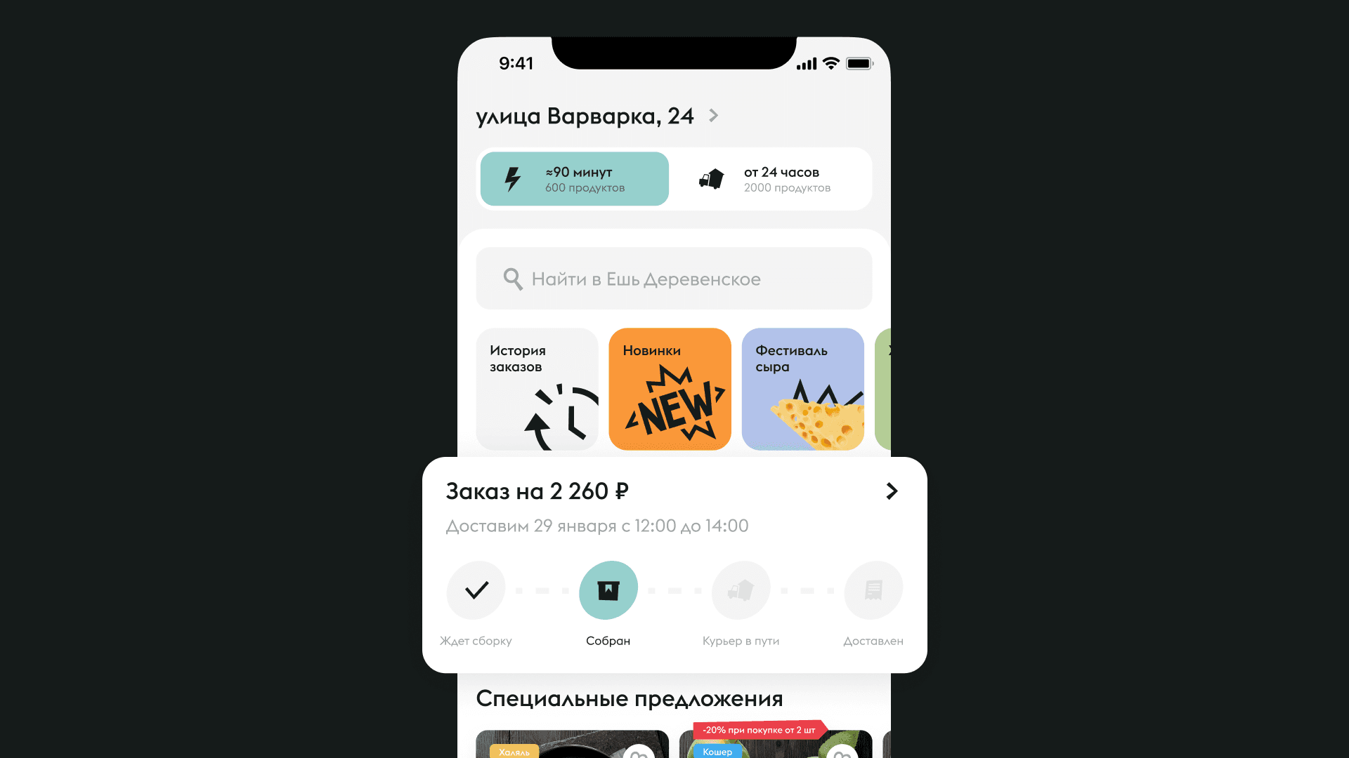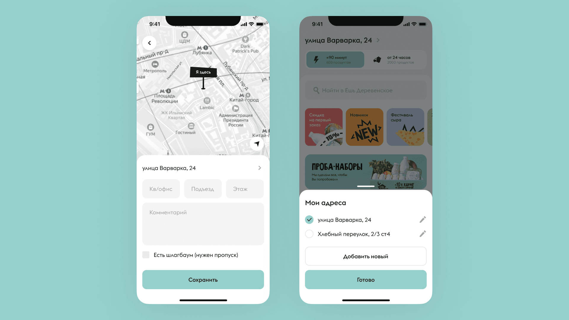 “Esh Derevenskoe” is a foodtech marketplace for farm products with home delivery, spanning a website, an account section, and a mobile app.